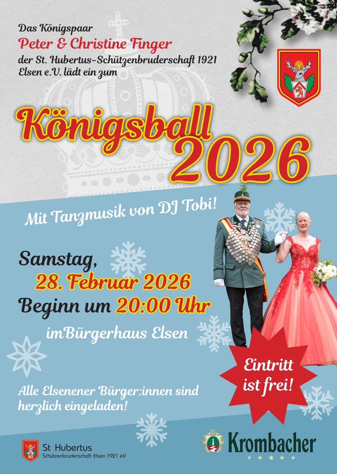 Am 28. Februar 2026 lädt das Königspaar Peter und Christine Finger uns alle zum großen Königsball ins Bürgerhaus Elsen ein.